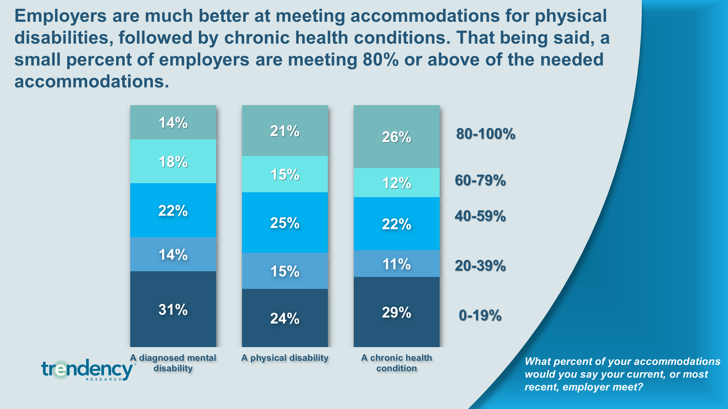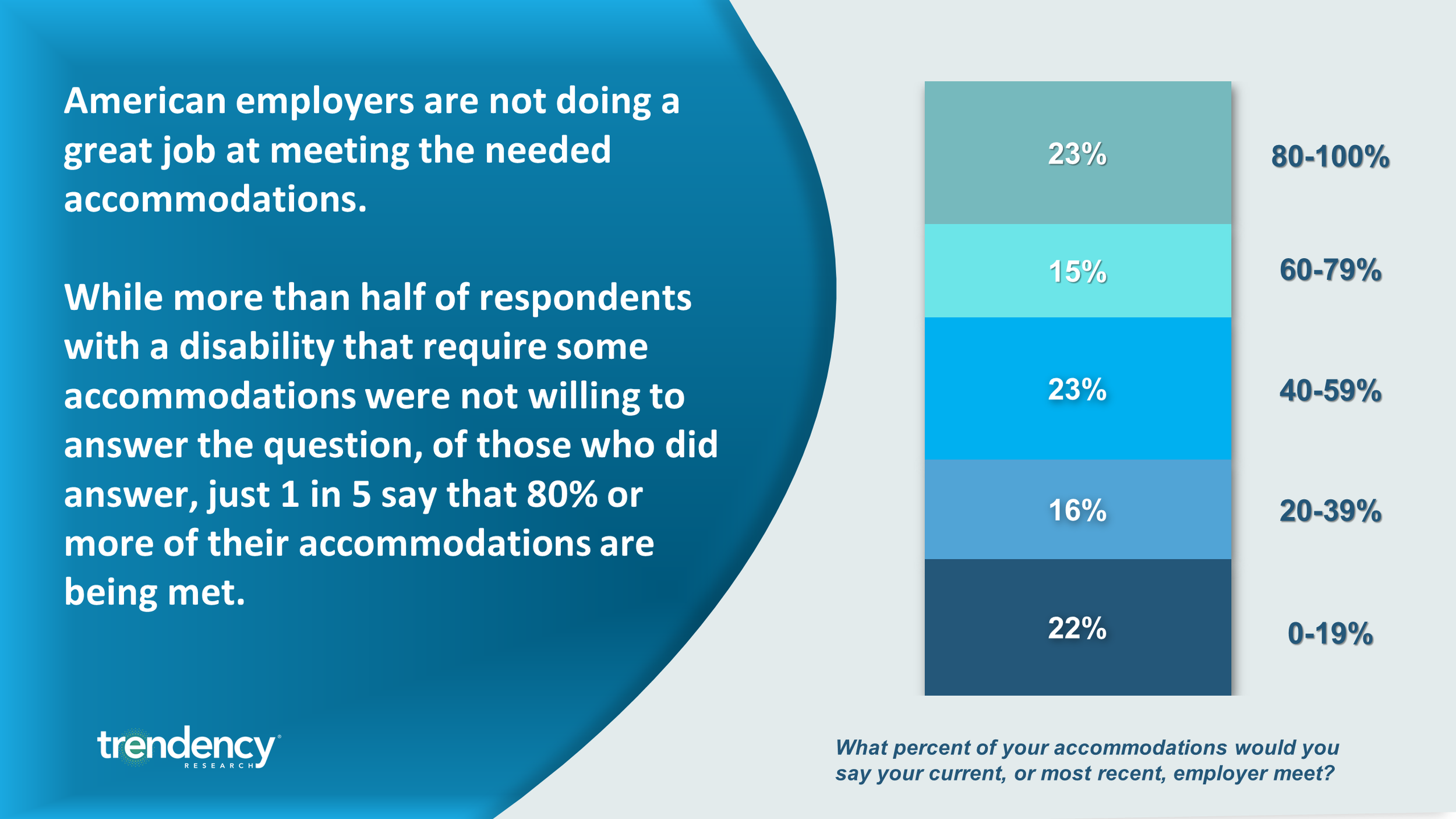 Sadly companies in America are not meeting the majority of accommodations needed by American workers with diagnosed disabilities. Just 23 percent say 80 percent or more of their needed accommodations are being met. This is roughly the same concentration of those who are having less than 20% of their needs met.