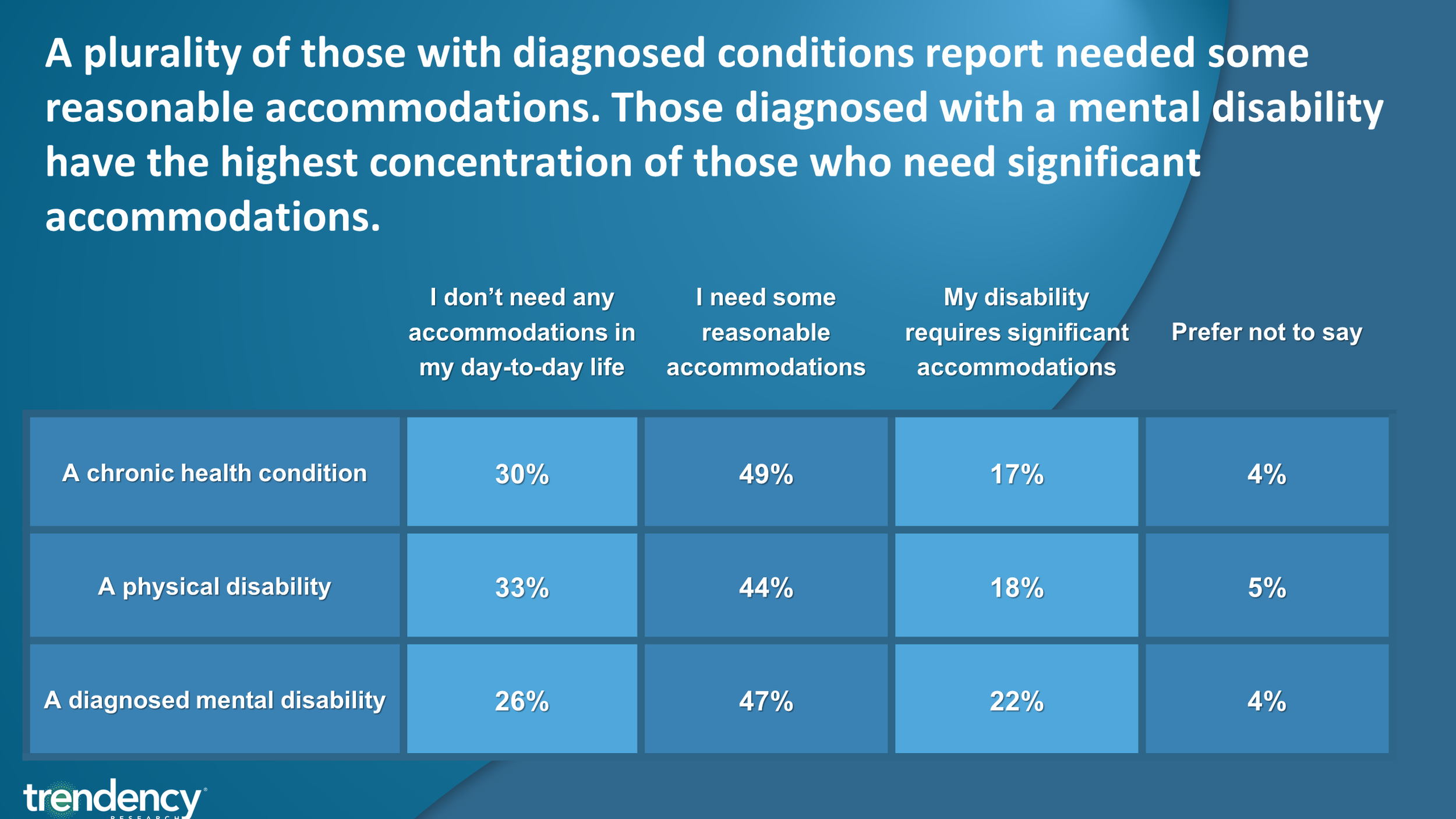 Among those who have a diagnosed disability two thirds report that they need some level of accommodations in their day to day life. This includes 2 in 5 who need some reasonable accommodations, and about 1 in 5 who need significant accommodations.