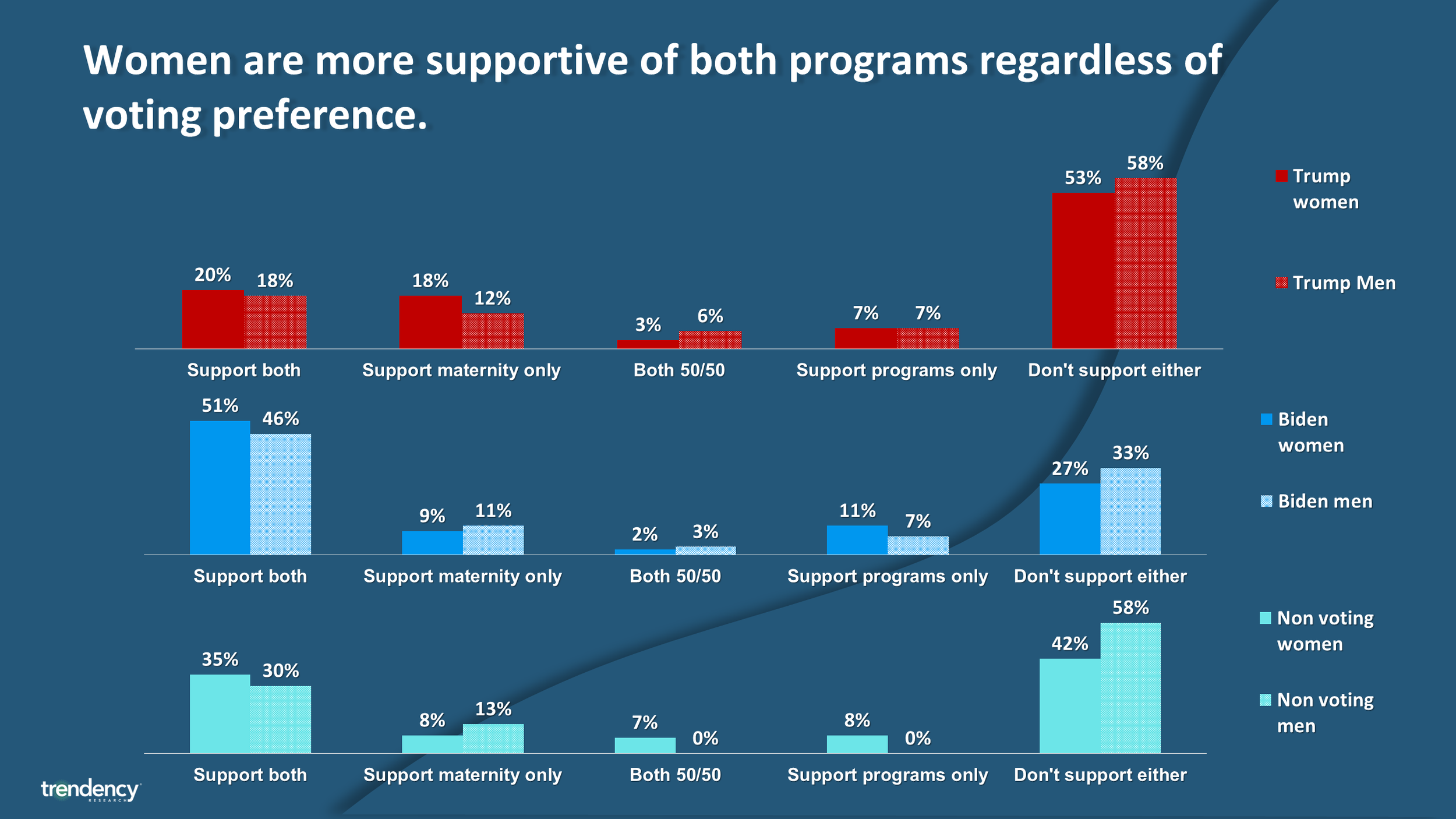 As we see above, the majority of female Biden voters support both a national maternity policy and more funding for programs focused on low-income women. A plurality of men who voted for Biden (46%) also support this view point. On the flipside, a majority of men and women who voted for Trump oppose both ideas, while roughly 1 in 5 support both ideas.