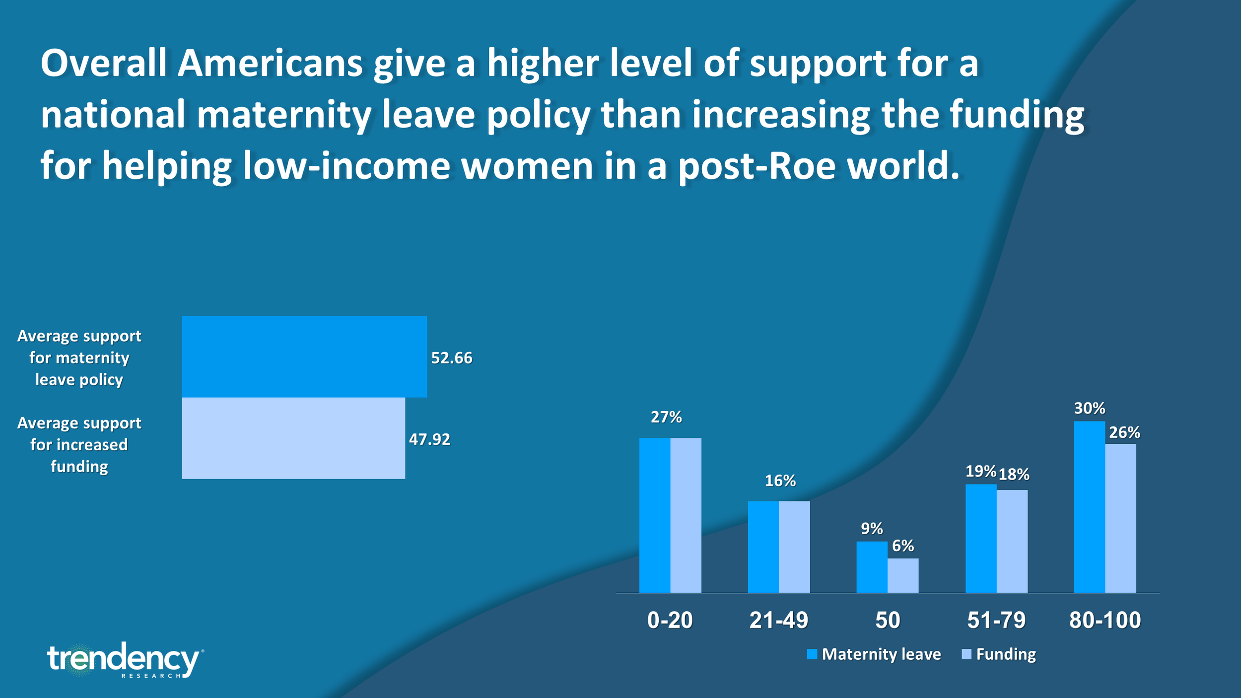 All this being said, other approaches to minimize the effects of overturning Roe become much more political in nature. When asked about their support for a national maternity leave policy and support for programs focused on low-income women, we find a slightly higher average support for the maternity leave policy (52.66) compared to programmatic funding (47.92).