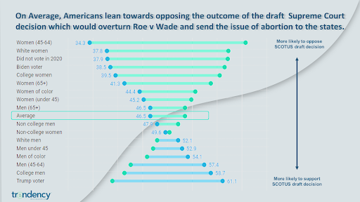 Looking at the question of abortion access from a slightly different angle, we asked Americans about their concern for lower-income women in light of the leaked decision. Concern among men over 65 for this group was three points higher than the national average and five points higher than women under 45.