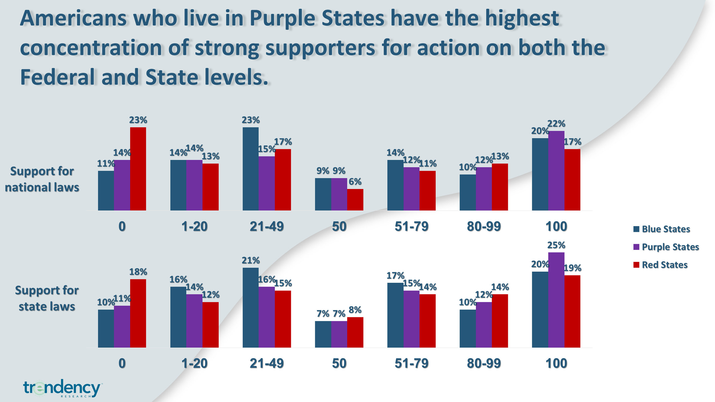 Similar to the results discussed above, women over the age of 65 are in strong support of national law (average score of 76), as are women who voted for Biden (average score of 75) and suburban women (70). Notably, views on state and federal laws tend to be more demographic-based, as opposed to state-based. The chart below shows that while there are certainly differences in opinion when we compare states that skew red, blue, or purple, the differences are not as great as one may expect.