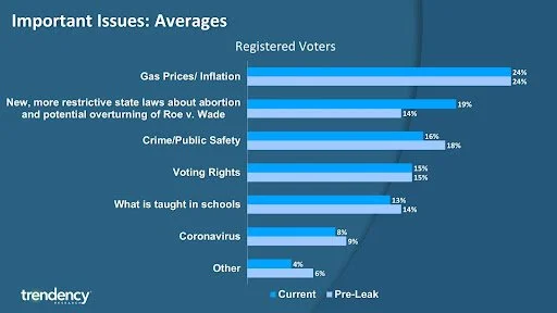 Since early 2021, we have been asking registered voters in our national panel what issues they are putting their focus on when it comes to their vote in 2022. Instead of the typical approach of asking that they rank which issue is most important to them, we ask panelists to allocate how much of their vote is going to be based on the issues listed in the chart below. The current results are from about one week after the draft was leaked, while the pre-leak includes data from before May 3rd.