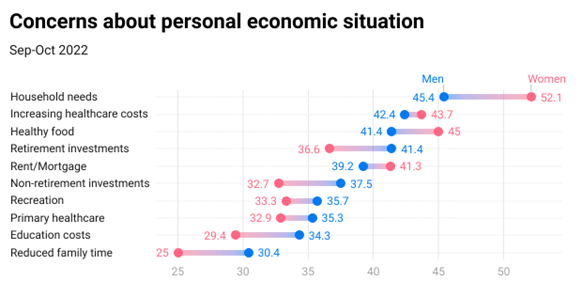 Women are much more concerned about household needs and the ability to provide healthy food, while less concerned about education costs, investments, and reduced family time.
