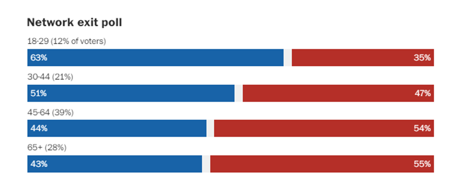 While this exercise was not set up as a political study, there is a strong relationship between how age cohorts are viewing their economic situation and their vote. The younger you are, the higher likelihood that you will think you are doing at least OK economically. There is then a steady increase in economic anxiety as you move up the age scale. When we look at the exit polling from the election last week’s we see the same pattern when it comes to support for the parties. Those under 30 had the highest concentration of Democratic voters and the concentration steadily decreased as you move up the age scale.