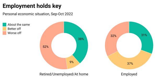 Not surprisingly, if you are currently employed, you tend to have a better overall view of your economic situation. This viewpoint holds, regardless of occupation; if you have a job, you are more shielded (at least mentally) from being affected by all the ups and downs of the economy. If you happen to be unemployed or retired, the view is not as rosy, with about half of this cohort feeling that their condition worsened over the last year. When breaking down the reason for not having a job, it is not about being unemployed and has more to do with age and or caregiving status. Indeed, about 2 in 5 unemployed Americans say their situation is now worse, but that is 15 percentage points lower than those who are retired and 10 points lower than people who are at home as a caregiver.