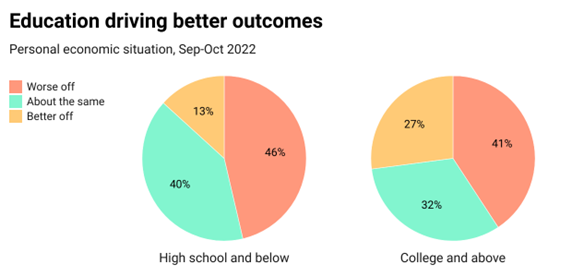 When it comes to education, we also see some interesting results. Among those with a college degree, about 2 in 5 (41%) say things have gotten worse for them in the last year. This is a similar number to reports from those without a degree (46%). While a plurality of both groups reported having a bad last year, the difference is in the concentration of those who feel things have improved compared to those who feel the past year was a step in the wrong direction. Just 13% of those without a degree said things got getter for them economically – that number is double among those with a degree.