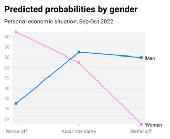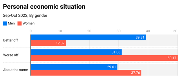 Half of the women in our sample said that their economic situation worsened over the last year, with about one-third reporting that it remained pretty much the same and only 12% saying that it became better. On the other side, 40% of men said they did better over the last year (more than three times higher than women), while roughly 3 in 10 said their situation stayed about the same and a similar number said they were worse off.
