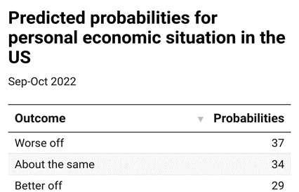 If you thought the last year was fun, it’s not looking much better for 2023 and 2024. Utilizing this data allowed us to look at what the predicted results for the future looked like based on variables such as gender, age, race, area (urban, semi-urban, or rural), income, and party affiliation to see what the probabilities are when it comes to perceptions of their personal economies and whether Americans feel they will move in a more positive or negative direction. Our results show that the general sentiment is bleak.