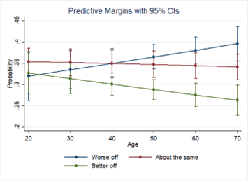 One of the better predictors occurs when looking at age. The older you are, the higher the chances are of saying that you are doing worse economically. At the age of 20, there is an almost even chance that a person will feel that they are doing better economically, staying about the same, or doing worse (with a slight edge to doing about the same). As we move up the age scale, the chances of that view of falling behind continues to increase, peaking with those who are 70 years old, where there is a 2 in 5 chance they will feel things are going worse for them.