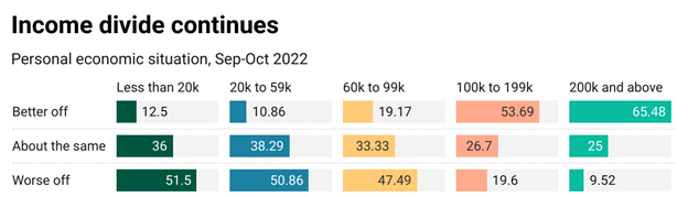 There is a distinct divide in economic perception based on household income. The existence of the divide was not a surprise, but the dividing line was.